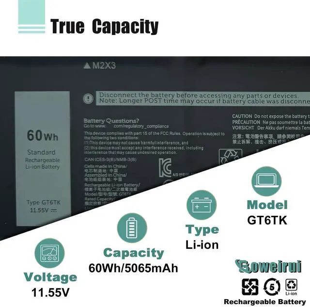 SpecificationsBattery Model : GT6TK Rechargeable Battery, Voltage: 11.55V, Capacity: 60Wh 5194mAh , Cell: 3-Cell, Type: Li-ion Battery, Package include: 1*GT6TK battery 1 set matching installation tools. 1*Instructions for GT6TK Laptop Battery for Latitude 9450 2-in-1 battery, All our products are 100% brand-new from manufacturer. Up to 500 recharge cycles over the life of the battery,