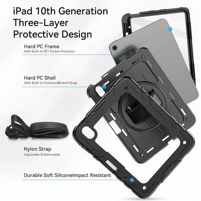 Stweap for iPad (A16) 11th/10th Generation Case 2025/2022 (11/ 10.9 ), Sturdy Heavy Duty Full-Body Shockproof Protective Case with Screen Protector, Rotating Stand, Hand/Shoulder Strap - Black