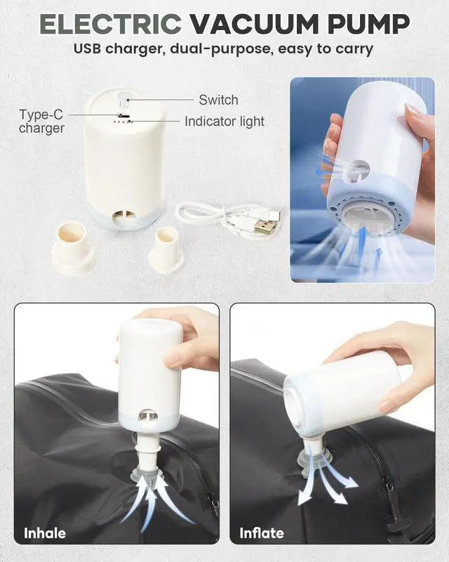 Portable Vacuum Pump - Comes with a compact vacuum pump for on-the-go convenience. Multiple nozzle attachments allow precise air extraction, whether you're quickly compressing clothes or adjusting storage space.