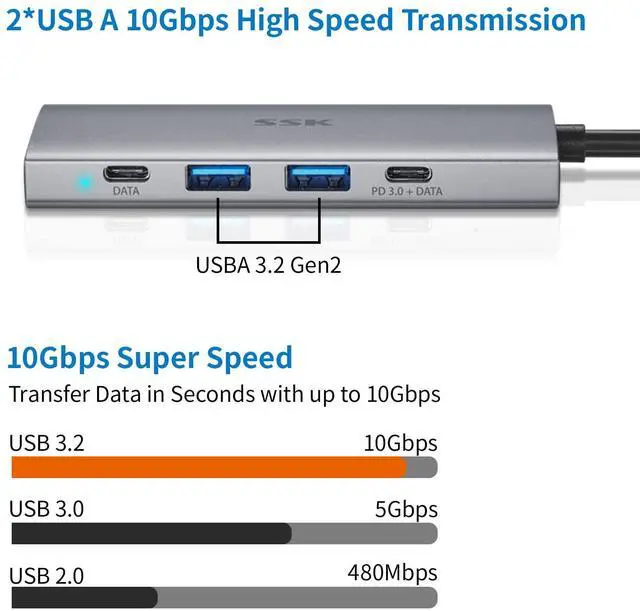 Reliable and Super-speed Syncing: The 100W PD 3.2 port of USB C dongle multiport adapter can fast charge Type C devices; SSK USB type c dock with USB 3.2 Gen 2 data transfe
