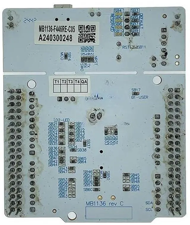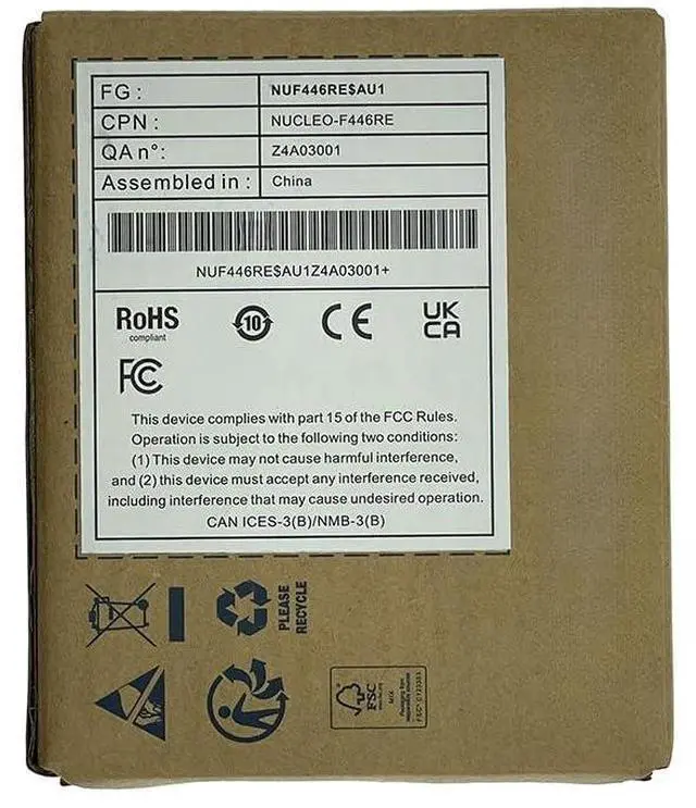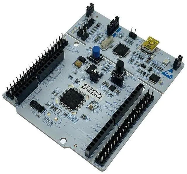 The NUCLEO-F446RE development board features an STM32F446RE Arm Cortex M4 microcontroller in the LQFP64 package.