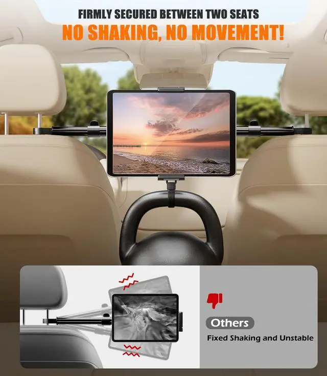 Reinforced Dual-Clamp Stability The Aaeiirey iPad holder for car is built with reinforced dual clamps and an aerospace-grade aluminum telescopic arm, ensuring rock-solid stability. Even on bumpy roads, this tablet holder for car keeps your device secure and shake-free, far stronger than single-headrest mounts.