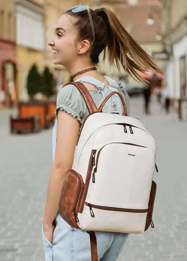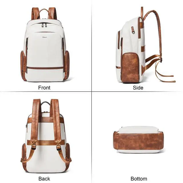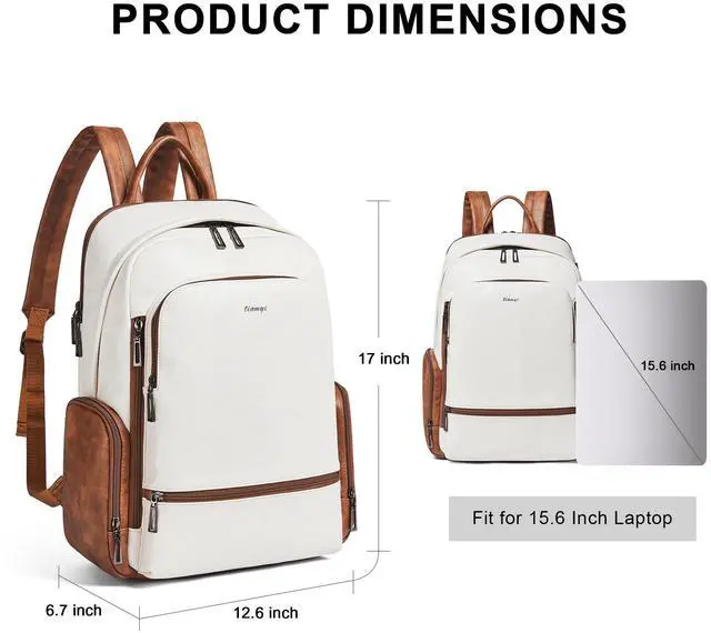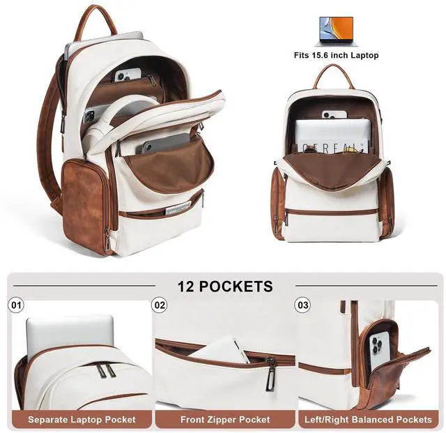 Large Capacity Backpack:This laptop backpack women has 12 pockets for easy storage: 1 main pocket containing 1 compartment with foam, 1 inner zipper pocket, 2 inner slit pockets; 1 separate laptop pocket (fits 15.6inch laptop); 2 outer side zipper pockets, 2 front zipper pockets, 2 front side zipper pocket and a matel key ring. So you can keep your office documents, cell phone, clothes,