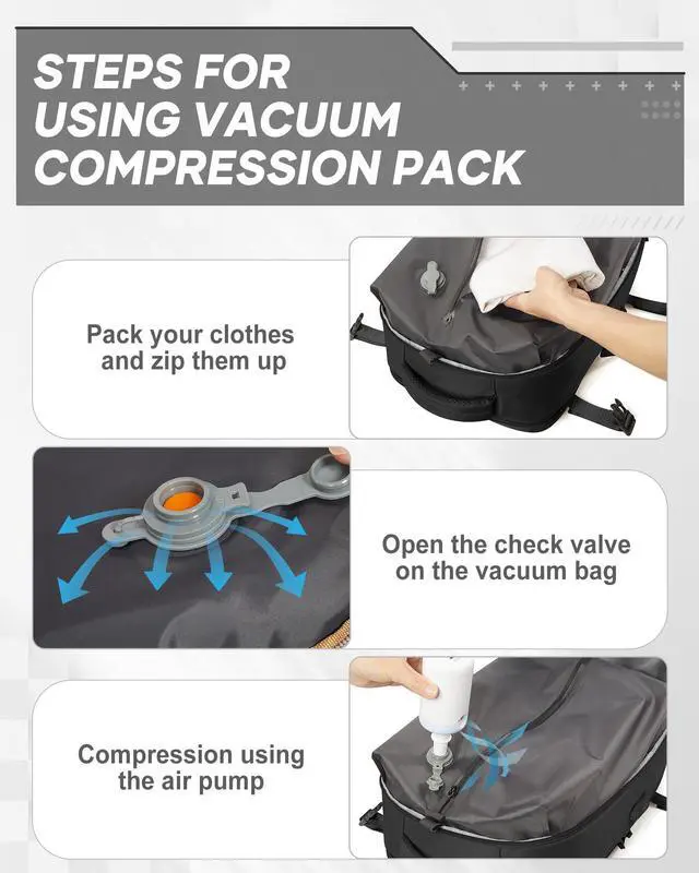 Space Saving Vacuum Compression: Utilize our advanced vacuum compression technology to maximize your packaging efficiency. The design of the one-way valve allows you to use our electric vacuum pump for rapid compression or manually press to release air. Up to 45 liters of clothing can be accommodated, enjoying optimized space where you no longer need to compromise on carrying or anything else.