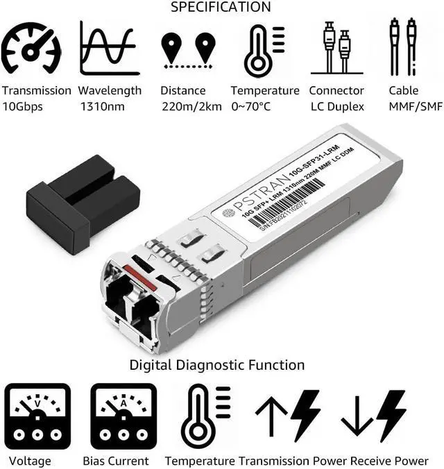 the 10GBASE-LRM SFP+ Optical Transceiver Module supports up to 220m over OM3 multimode fiber (MMF). Max. Power Consumption 1W Allowing for Prolonged Service Life, Commercial Temperature Range 0 to 70°C (32 to 158°F)