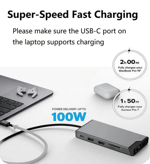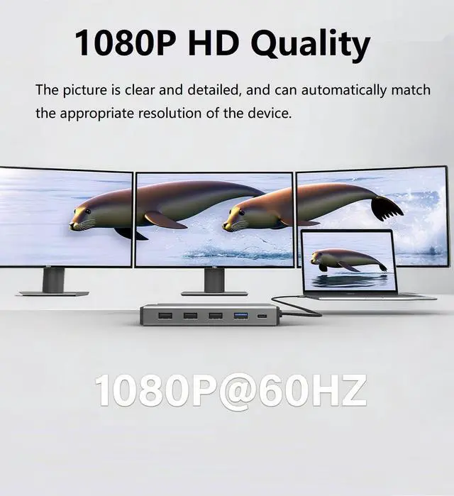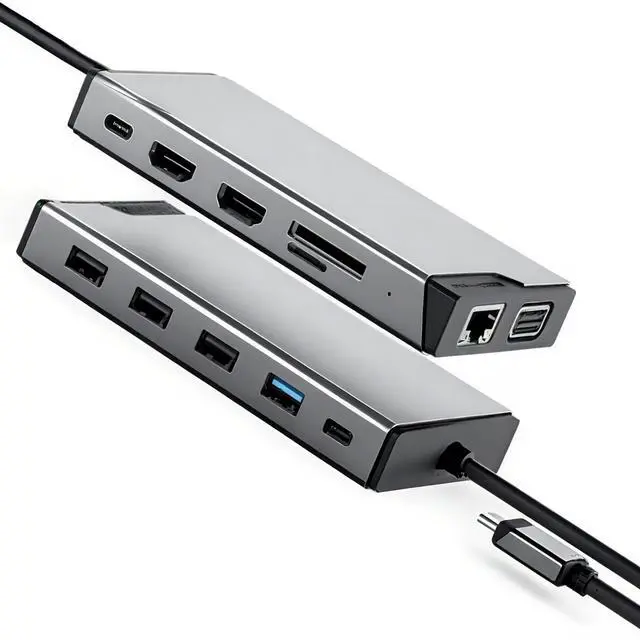 • 12-in-1 Expansion: HDMI x2 + VGA + USB 3.0 x1 + USB 2.0 x3 + Gigabit Ethernet + SD/TF Card Reader + 100W Power Delivery (Front/Back PD) + LED Indicator.