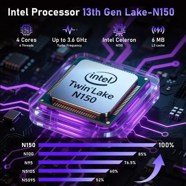 Higher Performance: The laptop uses Integrated Graphics (1GHz) and the latest 13th Gen N150 processor (4C/4T, 6MB, 6W, 0.8GHz-3.6GHz), which is much higher than processor N5095/N95/N100, providing more powerful multitasking capabilities.