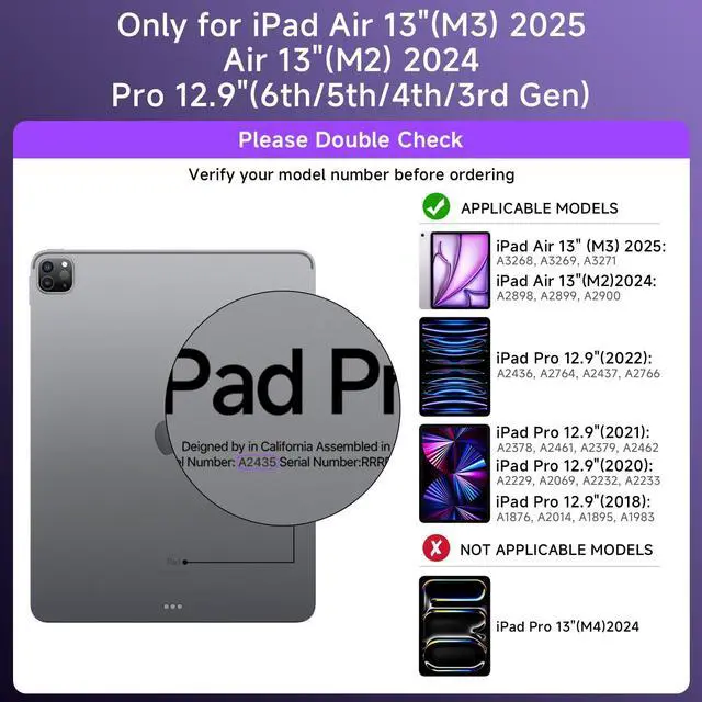 Compatibility: only compatible with iPad Air 13(M3/M2 2025/2024), iPad Pro 12.9 inch (2022/2021/2020/2018); models: A2764, A2437, A2436, A2378, A2379, A2461, A2462, A2229, A2069, A2232, A2233, A1876, A2014, A1895, A1983,Please check your iPad model number on the back of your device (starting with "A") before purchasing to ensure compatibility.