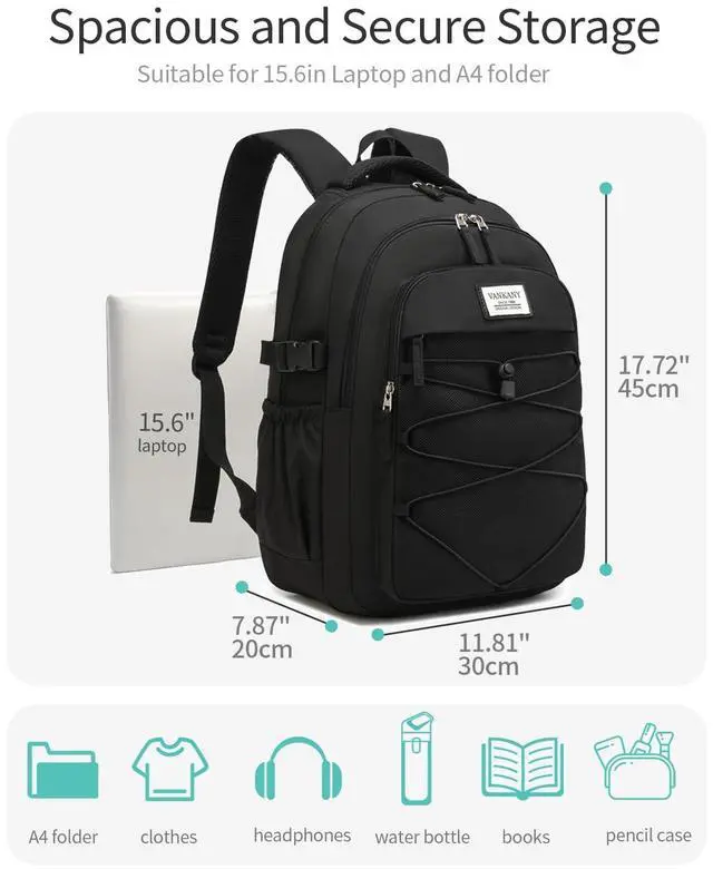 TOTAL ORGANIZATION: Simple & convenient design, 15.6" or 17.3" laptop sleeve, 1 huge main compartment for A4 folders, books and lunch box, middle pocket with organizer, front utility pockets, 2 side pockets and a back anti-theft pocket and a front bungee system for additional storage. Whether your carrying textbooks, tech gadgets, or travel essentials everything has its place within this versatile pack.