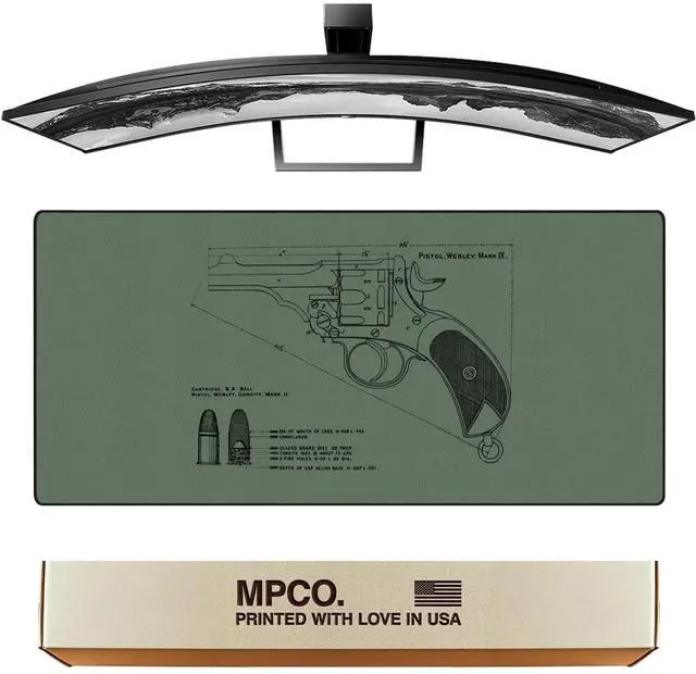 MPCO. Blueprints Large Gaming Desk Pad - 36" x 17" Aeroglyde Fabric Pistol Webly Mark IV Green Desk Mats - Non-Slip, Washable, Smooth Glide for Precision Gaming & Work