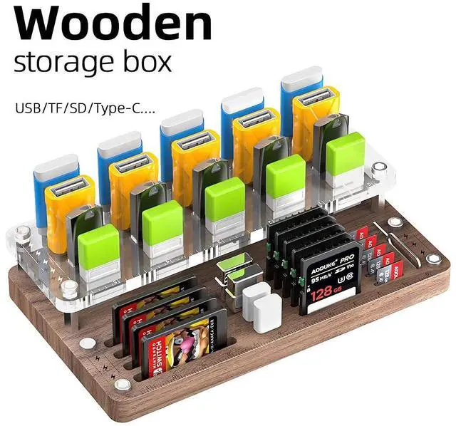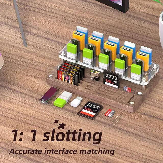 Brand new way to keep all your USB's and SD cards organized. Easily remove and place your cards into the designated slots. Stores large amounts of cards in a stylish way. The compact design looks good on anybodies desk. Perfect for the people who consistently use cards and need a quick storage solution. You can now easily see all your necessary cards and usb's right on your desk.