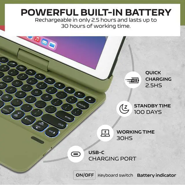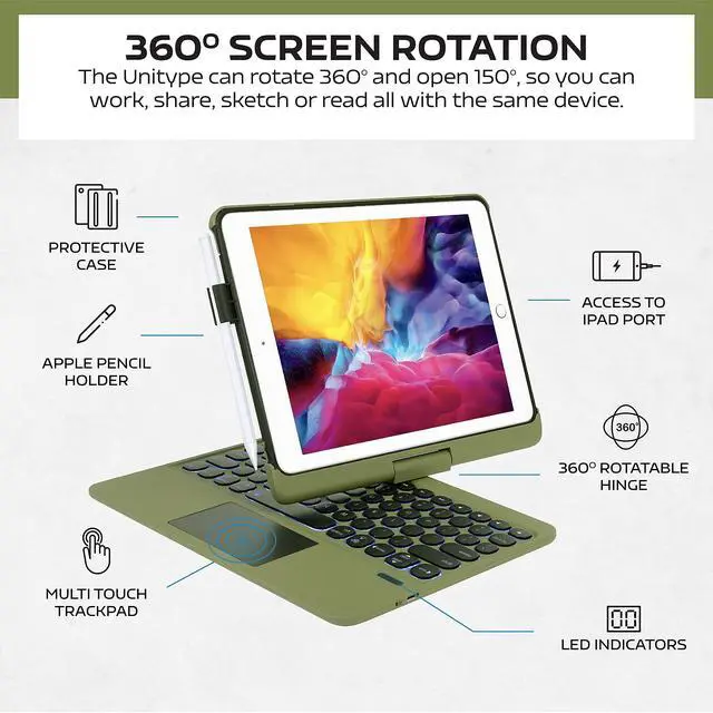 360 Degrees of freedomThe iPad keyboard case support 360° rotation and 180° flip open, equipped with a high-strength universal axel that allows the user to turn or tilt the screen in absolutely any direction for the most comfortable viewing angle- Typing, Reading, Gaming - giving you amazing versatility.