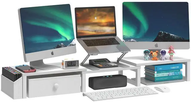 LAND·VOI Heavy Duty Dual Monitor Stand, Holds 2 Screens Up to 27 Inches, Adjustable Length and Angle Monitor Riser, Desk Organizer with Side Pockets and Drawers, Home Office Desk Storage, White
