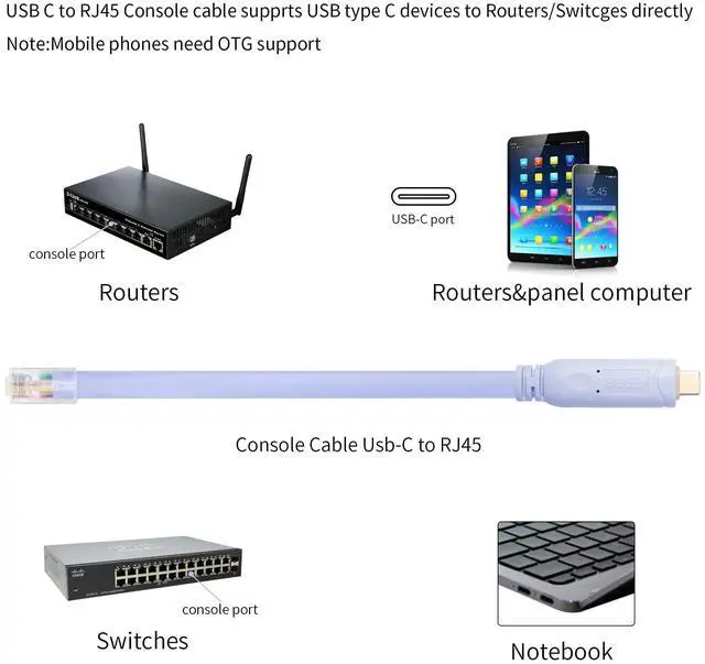 Connects a mobie phone (needs OTG support), tablet computer or Notebook(The port is ausb-c type) touch to the console port on Cisco networking gear.