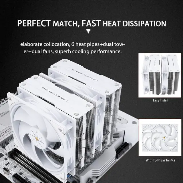 [Cooling Performance] The CPU cooler is a dual-tower, dual-fan structure with a White anodised frosted top cover + 6 fully plated heatpipes + precision reflow soldered micro-engraved copper base, paired with a 2000RPM high RPM PWM fan, which easily disperses CPU temperatures and further enhances the cooling efficacy of the cooler.