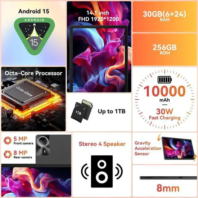 30GB + 256GBOur Android tablet comes with 30GB (6+24GB) RAM 256GB ROM and maximun 1TB TF card ( not included )expandable ensures you of a fast APP launch and smooth gaming experience. URAO tablet also come with pre-installed Google Play Store, you c