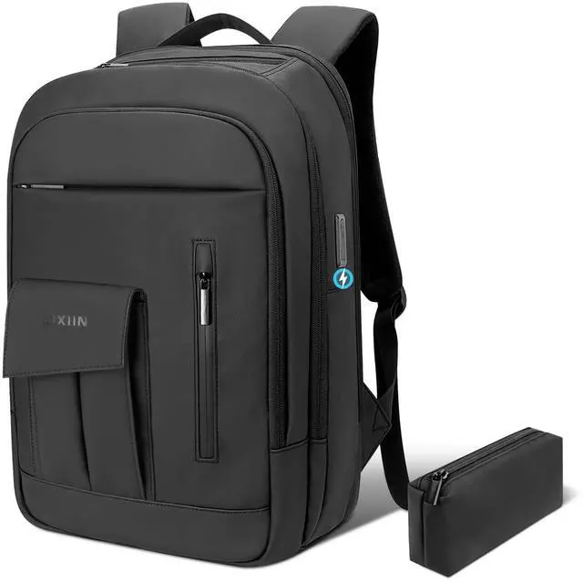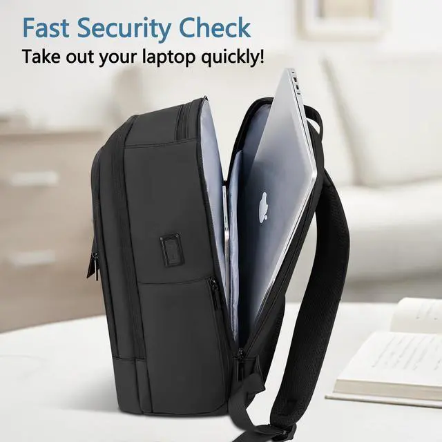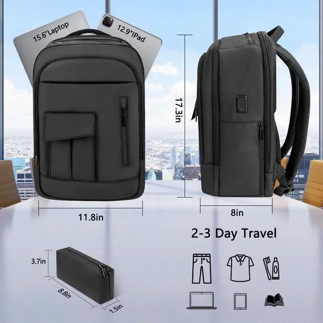 Large DesignThis work backpack is up to 8inch thick and can hold enough for a 2-3 day trip.. In the front and top of the waterproof backpack there is a unique pouch designed for storing your data cable car keys headphones etc.. This anti-theft backpack features a unique hidden zipper design on the surface to protect your valuables.. The main compartment have multiple multi-functional pockets..The backpack includes a dedicated laptop compartment for convenient airport security checks.