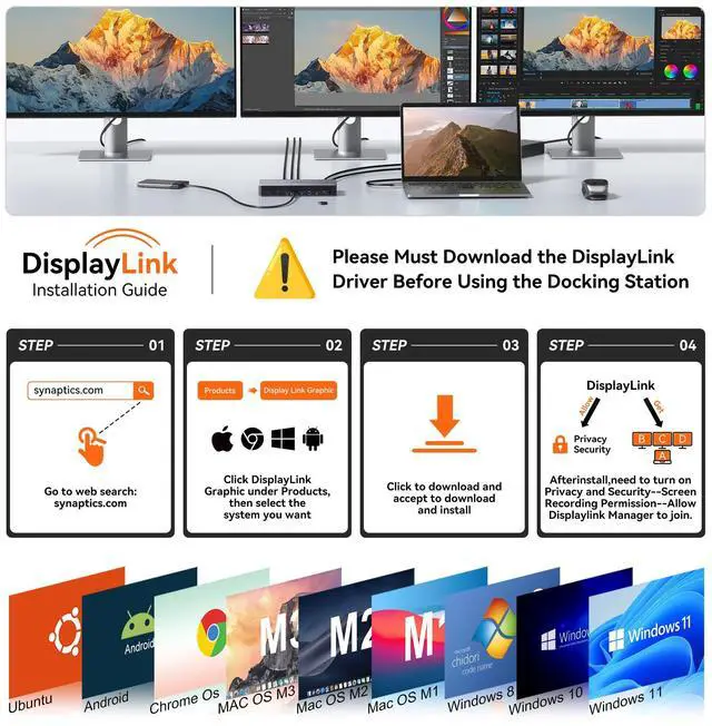 Triple/Dual 4K@60Hz Display Monitors Docking Station: The laptop docking station 3 monitors with 3 HDMI+2 DisplayPort by installing the DisplayLink driver, your MacBook is not limited by the M1/M2/M3/M4 chip, easily enjoy various multi display and up to triple 4K@60Hz display. HDMI1 of the display link adapter max up to 8K@30Hz/4K@120Hz when used alone (only under DP1.4 on Windows), other video output ports must download the displaylink driver to work. Note: Your laptop must support