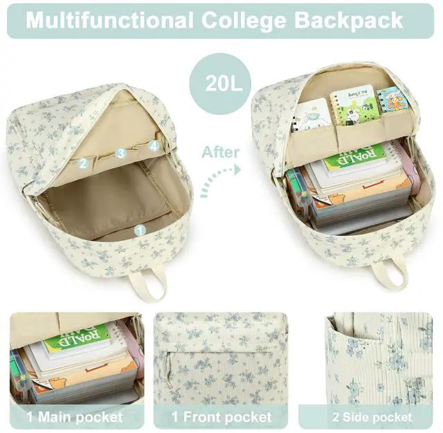 Cute cream corduroy material is soft, durable, and machine washable. This school backpacks can hold up the weight of everything a highschooler needs in their pack. Womens backpack perfect for travel carry on backapck wherever you want to go.