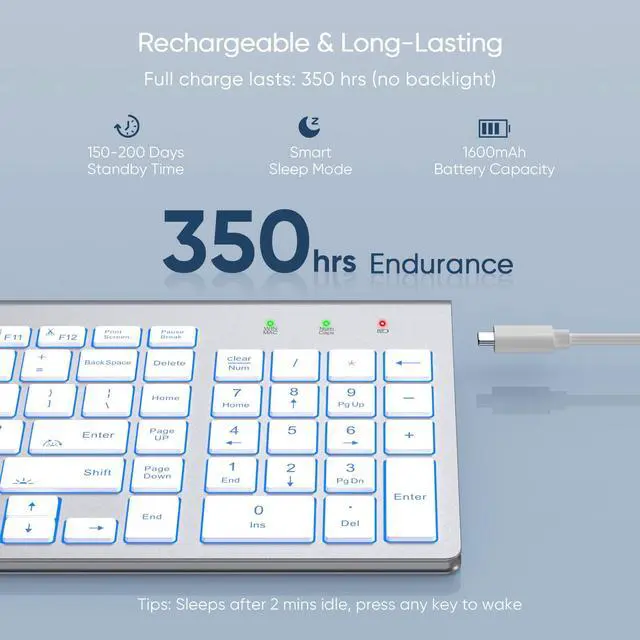 RECHARGEABLE & POWER-SAVING: Equipped with a 1600mAh rechargeable battery, this computer keyboard offers up to 350 hours of use without the backlight. Its ON/OFF switch and auto-sleep mode intelligently conserves energy