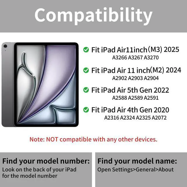 Compatible: Designed for iPad Air 11 Inch M3 2025 (A3266/A3267/A3270), for iPad Air 11 Inch M2 2024(A2902/A2903/A2904), for iPad Air 5th Generation 2022 10.9 Inch (A2589/A2591/A2588), for iPad Air 4th Generation 2020 (A2072/A2316/A2324/A2325), Please check the back bottom of your iPad to verify the model numberAXXXbefore purchase