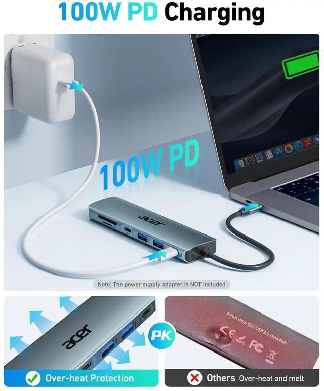 [7-in-1 Multi-port USB C Hub] Acer USBC adapter macbook is made of Aluminum material, expands a USB-C port to 7 ports (1*HDMI 4K@30HZ, 2*USB 3.1, 1*USB-C, 1*Type-C PD charging, 1*MicroSD card slot, 1*SD card slot). The USB hub expands your work from home, office, or on the go. Note: Please connect the power supply with the PD port to provide sufficient power for the USB C hub.
