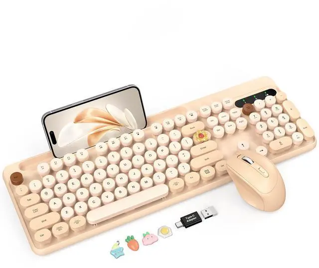 Wireless Keyboard and Mouse Combo, Retro Round Keycaps, Cute Full-Size Typewriter Keyboard with Phone Holder, Sleep Mode, 2.4GH z Cordless Connection for Windows/PC/Laptop (Milk-Tea Colorful)