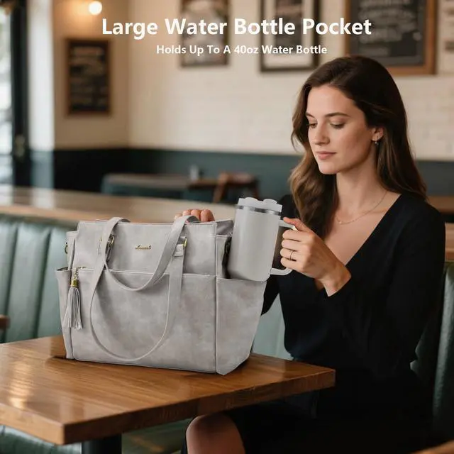 The work bag features two large side pockets that can hold a 40oz water bottle, making it perfect for long commutes or all-day meetings.
