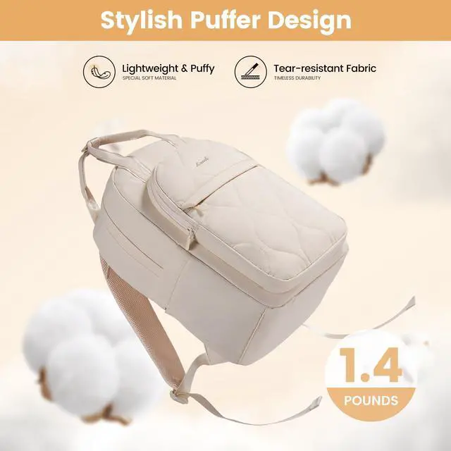 LOVEVOOK Laptop Backpack for Women, College Travel Backpack Puffer Womens Backpack for 15.6 Inch Laptop, Water-Resistant Quilted Casual Daypack, Beige