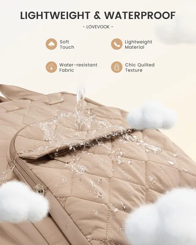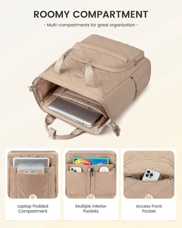 LOVEVOOK Laptop Backpack for Women, Puffer Quilted Computer Bag for Travel Work Business, Casual Daypack for Teacher Nurse, 17.3 Inch, Khaki