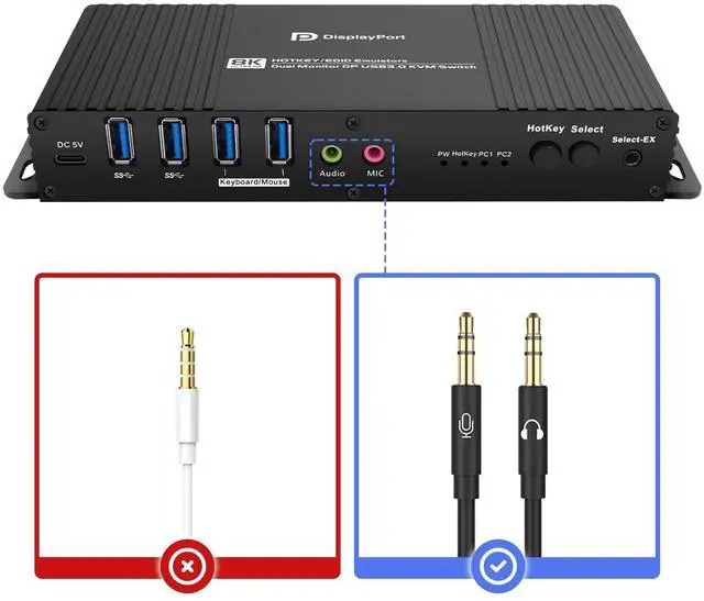 kvm Switch 2 Monitors 2 Computers display port 4k 144hz SWITCH Mode: the Dual Monitor kvm Switch displayport 4k 144hz Supports Four switching methods to meet with different needs, including keyboard hotkeys, mouse hotkeys, push button, wired remote ; switching only takes several seconds after first set-up;