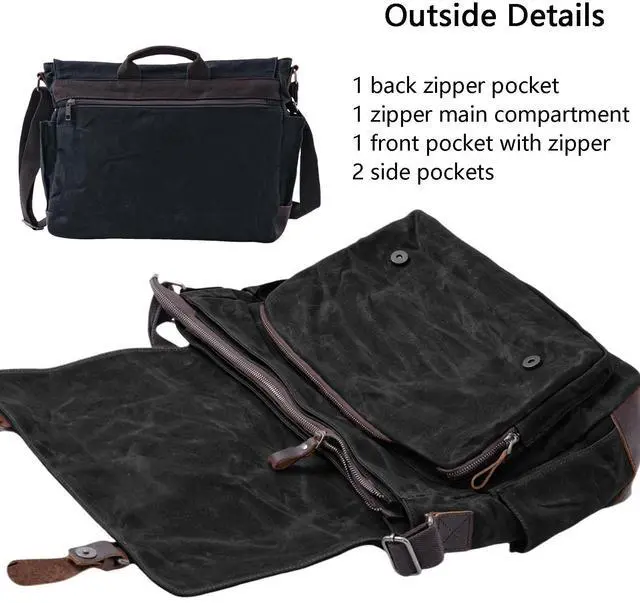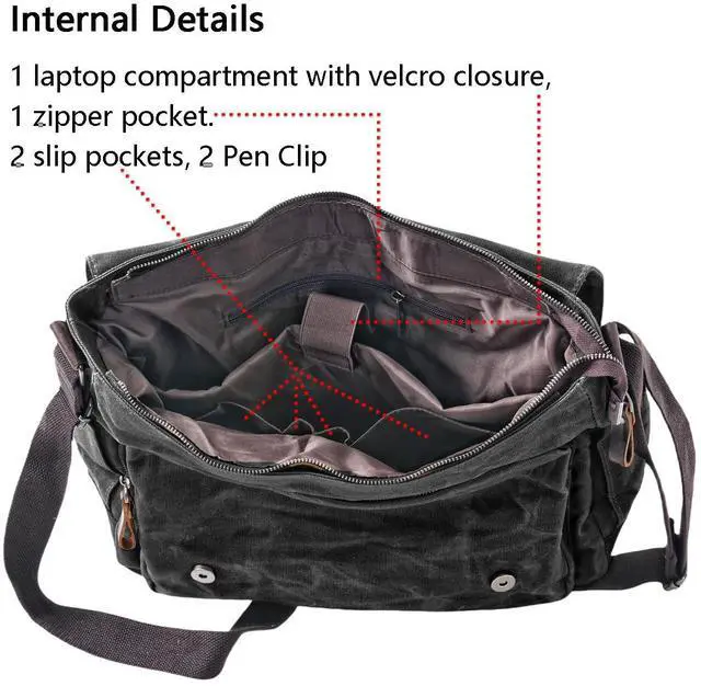 Multiple Pockets: 1 zipper zip pocket on the back, 2 side pockets, under the flap has 1 zipper pocket and 1 main zipper compartment. Internal includs 1 padded laptop compartment fits 15.6 inch laptop with velcro closure,2 slip pockets and 1 zipper pocket.