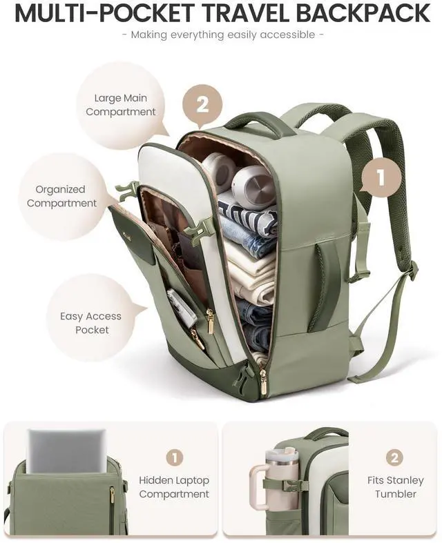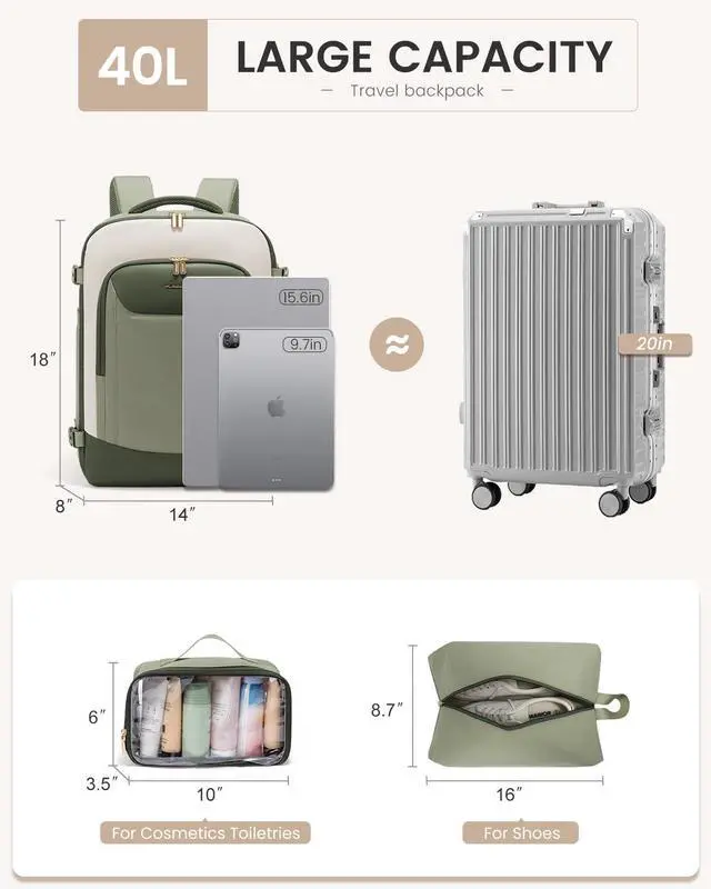 • Spacious & Well-OrganizedWith 40L capacity, this travel backpack features 4 main compartments and multiple pockets for effortless organization, plus a built-in elastic band to secure travel items. Perfectly fits 3-7 days of travel essentials.