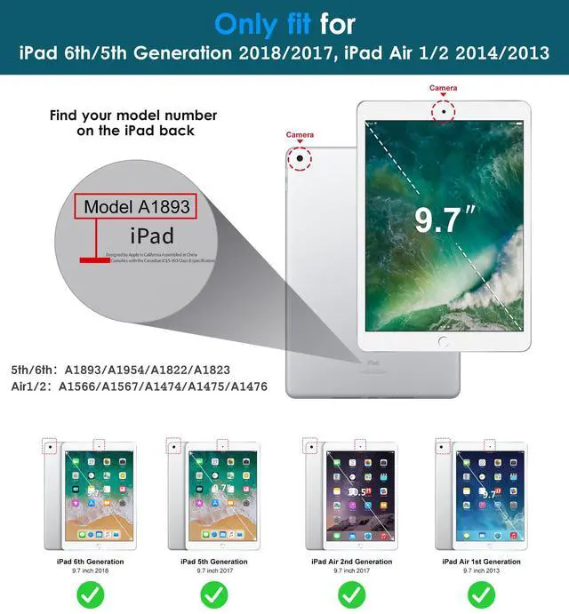Specifically designed for Apple iPad 6th/5th Generation 9.7 Inch Tablet 2018/2017 Release (Model Number: A1893/A1954/A1822/A1823), also fit iPad Air 2/1 2014/2013 Released (Model Number: A1566/A1567/A1474/A1475/A1476). Not compatible with any other iPad model.