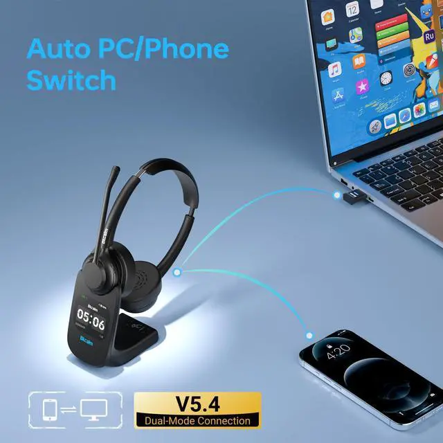 Blucalm V 5.4 Wireless Headset with AI Touchscreen Base, Business Computer Headset with Microphone & 2.4G Dongle for PC, Wireless Headphones with Noise-Cancelling Mic for Work Office, WFH, Teams, Zoom