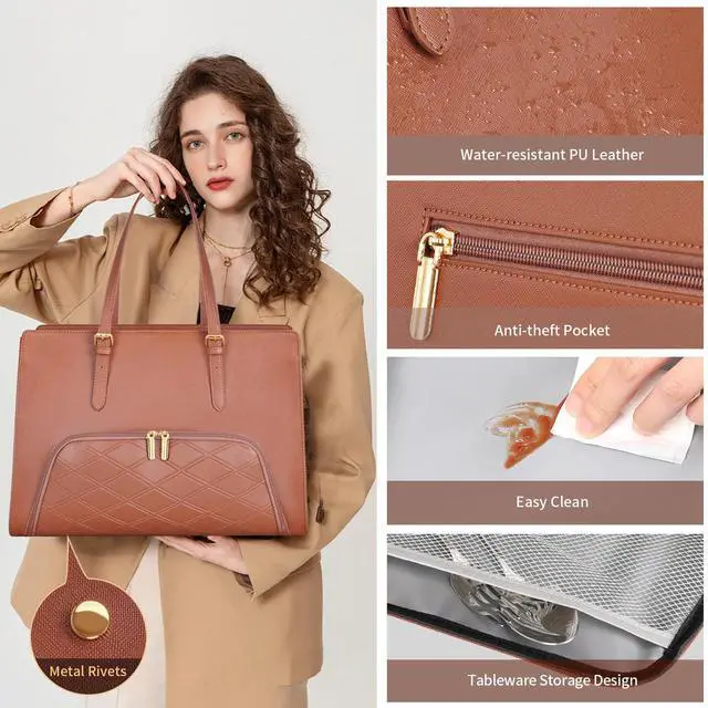 Jetviivid Laptop Tote Bag with Lunch Compartment, 15.6 Inch Work Bag PU Leather Computer Briefcase for Women, Laptop Shoulder Handbag for Business, Office, Work, Brown