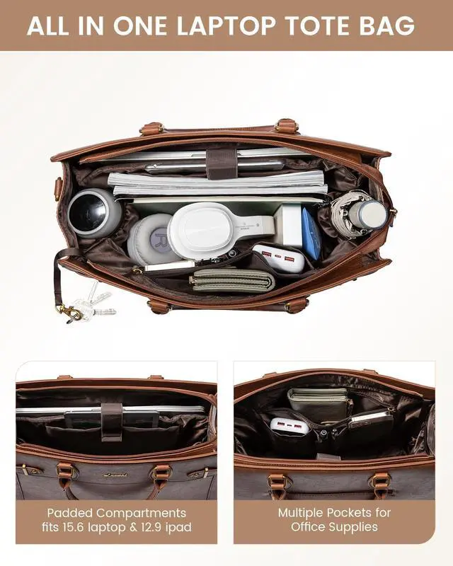 Multi-Pocket The work bag has 1 compartment for laptop and 1 iPad tablet pouch, plus 1 key leash, 2 pen slots, 2 slip pockets, 2 side pockets, 1 interior zip pocket, and 1 back zip pocket, keeping your items secure and organized.