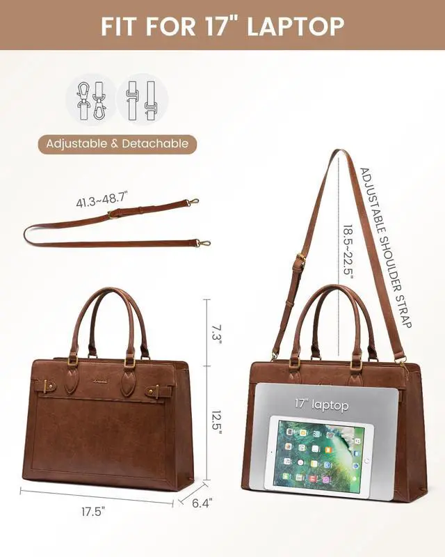 Separate Laptop CompartmentThe office bag for women features a separate padded compartment liner for 17-inch laptop. The dedicated space keeps your computer isolated from other items, minimizing the impact from bumps and scratches.