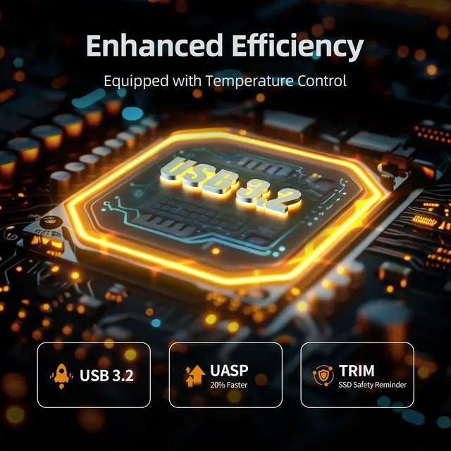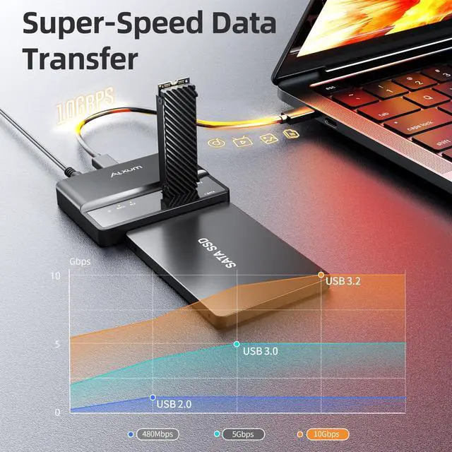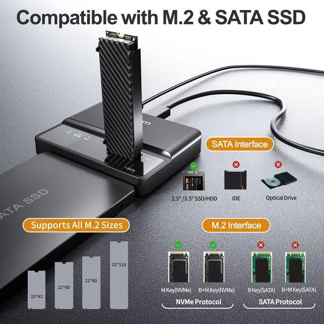 2 in 1 M.2 SATA SSD Reader ExternalTool-free install, plug-and-play, no driver required, and Hot-Pluggable support with automatic hibernation after 30 minutes of no read/write operations. This SSD Enclosure features both PCIe NVMe M.2 and SATA dual interfaces, supporting dual-disk display and simultaneous read access, simplifying data management and migration. Whether youre using an M.2 or SATA hard drive, this M.2 SSD enclosure meets your needs.