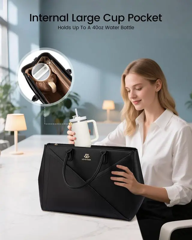 Inner Large Cup Holder: Lovevook laptop bag for women features an interior pocket that can hold a 40-ounce water bottle and fits perfectly over the handle to keep the bottle upright and prevent spills. Combining function and style, it's perfect for long commutes or all-day meetings.