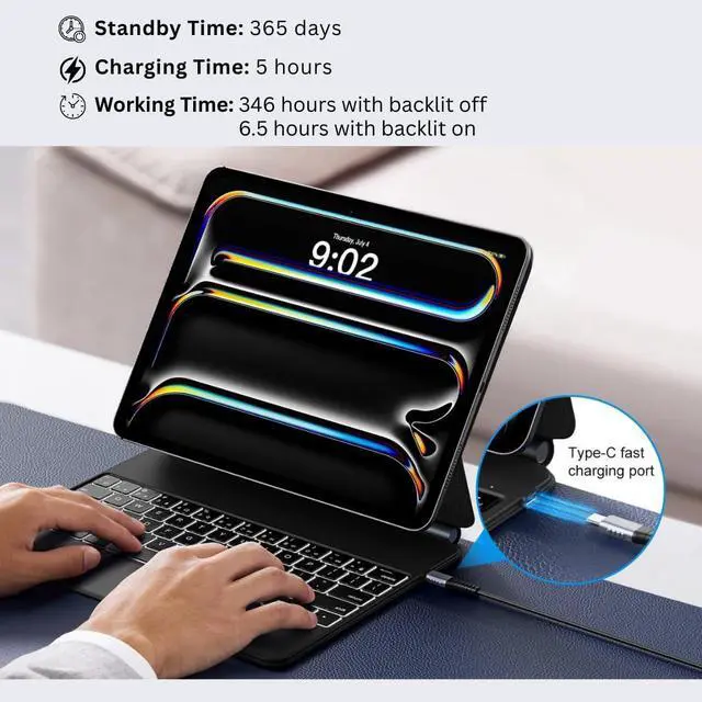 Fast Charging Method: The 750mAh battery and ultra-efficient design let you work longer on a single charge. Work daily for 3 months or nightly for 2 weeks on a single charge then recharge quickly with convenient USB-C charging. The keyboard case also comes with a backlight. The 3 brightness leve
