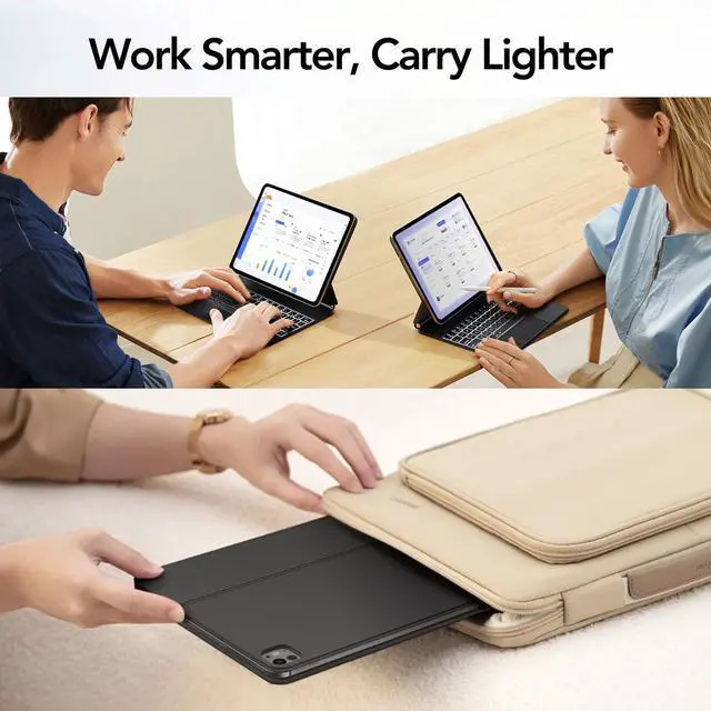 Easy-Set Magnetic Stand: you can attach your iPad to the back cover magnetically, Set the floating cantilever stand with one smooth motion, and transform your iPad turn your tablet into a highly performant and easy-to-use laptop within a second! Which is perfect for traveling, business, and school.