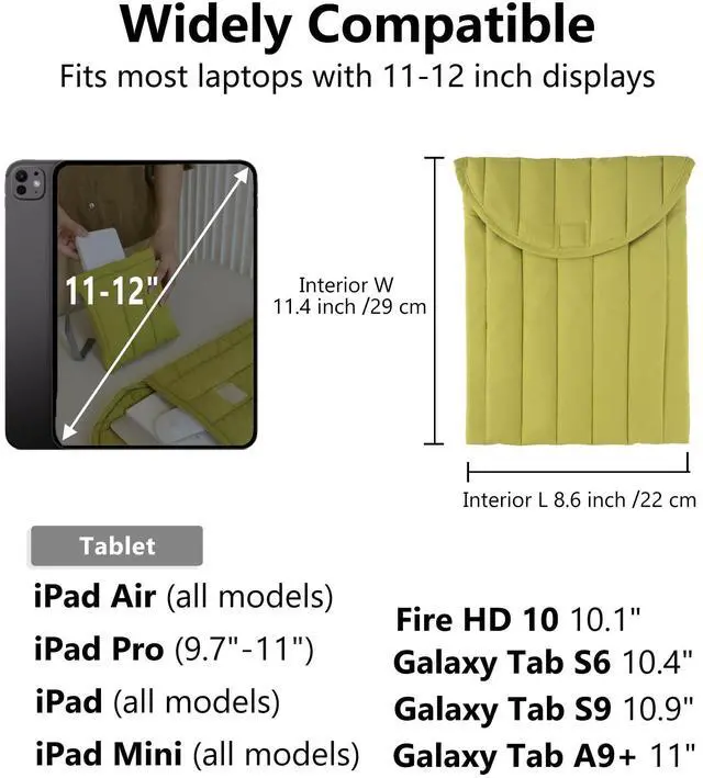 Wide Compatibility: 11-12 inch capacity, compatible with all 11-12 inch laptops. Compatible with 10.9-inch iPad 10th generation, iPad 10.2-inch 7th, 8th, 9th generation, 11-inch iPad Air M2, 11-inch iPad Pro M4, iPad mini 8.3-inch 6th generation