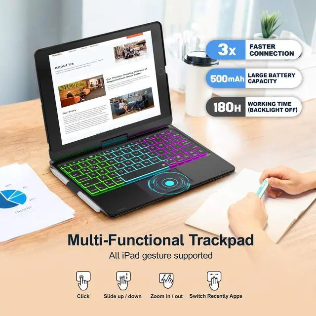 Multi-Touch TrackpadiPad 9th generation case with keyboard features a large multi-touch trackpad for convenient navigation and flexible gesture control. Enjoy browsing, designing, or drafting with unparalleled convenience. You don't need to to manually swipe the iPad screen