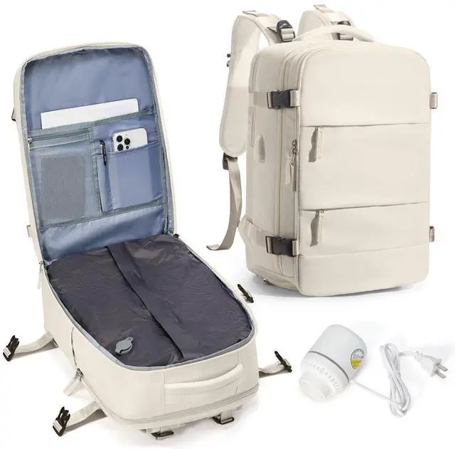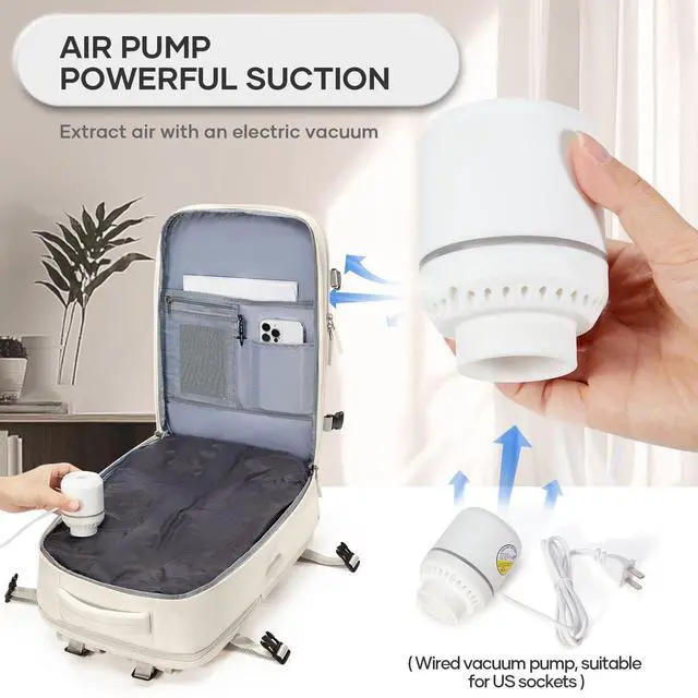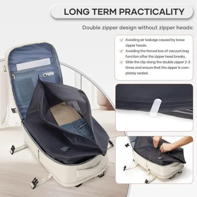 The most unique feature of the vacuum bag equipped inside this travel backpack is that we use a double zipper design without zipper heads, which not only avoids the possibility of air leakage caused by loose zipper heads, but also avoids the possibility of the vacuum bag being forced to be invalidated after the zipper heads break. You just need to use the zipper clip and slide it back and forth a few times to ensure that the zipper is fully closed.