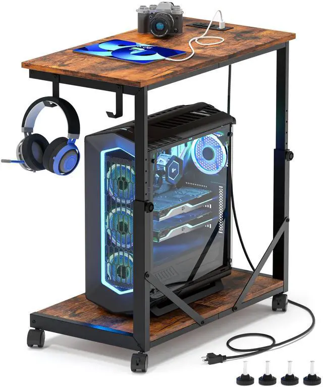Akxomel 25.2" W PC Stand, 25.2"- 29.9" H Adjustable Computer Tower Stand with Charging Station, Mobile Rolling PC Cart for Floor with Hooks, CPU Holder for Gaming, Office, Rustic Brown