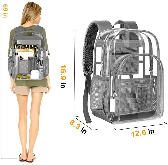 LARGE CAPACITY: Dimensions 12.6" x 8.3" x 16.9"(L x W x H), This transparent backpack has enough space to hold your college and work belongings. 1 x large main compartment, 1 x small mesh pocket inside main compartment for phones or cards, 1 x front pocket with pens, iPad pocket and key buckle, 2 x side pouches for water bottle and umbrella.