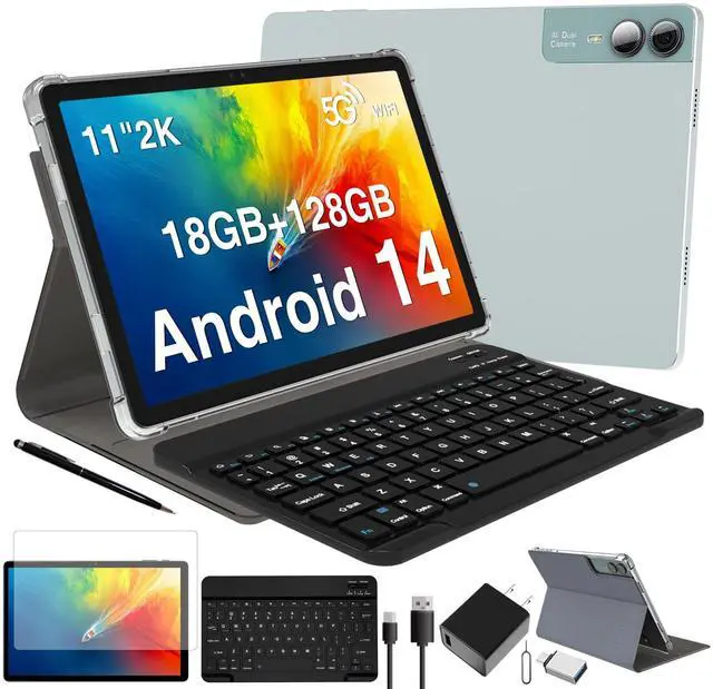 2025 Latest 11 inch Android 14 Tablet, 18GB RAM 128GB ROM, 1TB Expandable, 2K Display, T616 Octa-Core, 13MP+5MP+5MP Camera, 9000mAh Battery, GPS, Face ID, Quad Speakers, Tablet with Keyboard and Pen