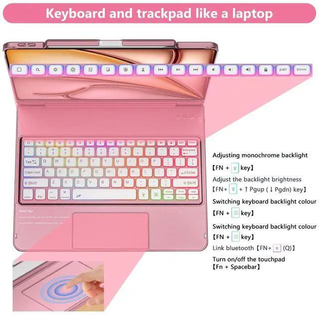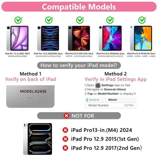 CompatibilityThe keyboard case is perfectly compatible with the latest iPad air 13 inch (M2) 2024 (A2898, A2899, A2900), For iPad air 13 inch (M3) 2025 (A3269, A3271), For iPad Pro 12.9 inch 6th Generation 2022 (A2436, A2764, A2437, A2766), For iPad Pro 12.9 inch 5th Generation 2021 (A2378, A2461, A2379, A2462), For iPad Pro 12.9 inch 4th Generation 2020 (A2229, A2069, A2232, A2233), For iPad Pro 12.9 inch 3rd Generation 2018 (A1876, A2014, A1895, A1983).