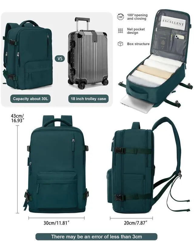 Compression Bag and Hand Vacuum PumpThis travel backpack comes with a translucent vacuum compression bag and a manual vacuum pump. The size of the vacuum compression bag is 60*40CM/23.62*15.75inch, and the size of the manual vacuum pump is 23CM/9.06inch (manual measurement, error 1-2CM). The vacuum compression bag can compress the volume of fluffy clothes and take up less space, so you can carry more items you need while travelling.
